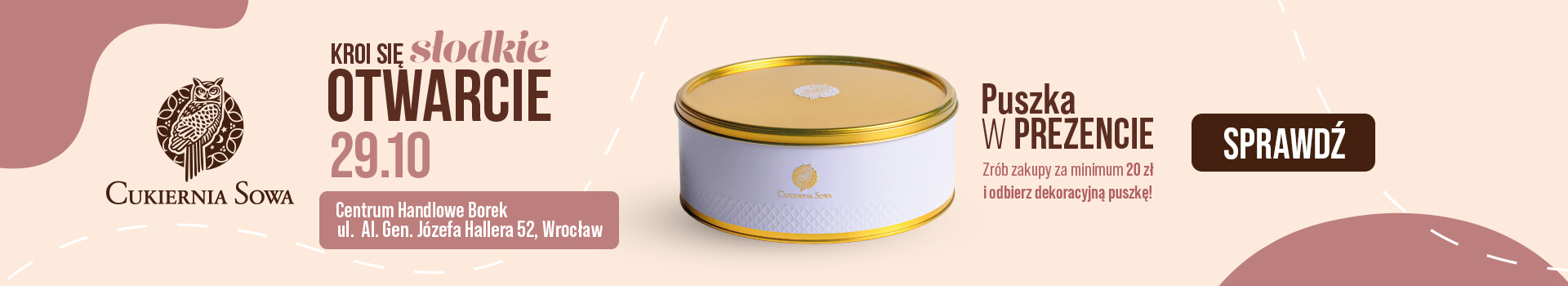 Z okazji Słodkiego Otwarcia, Cukiernia Sowa przygotowała wyjątkową niespodziankę dla pierwszych 100 klientów! Zrób zakupy za minimum 20 zł i odbierz piękną, dekoracyjną puszkę na słodkości w prezencie. To idealny dodatek do każdej kuchni!